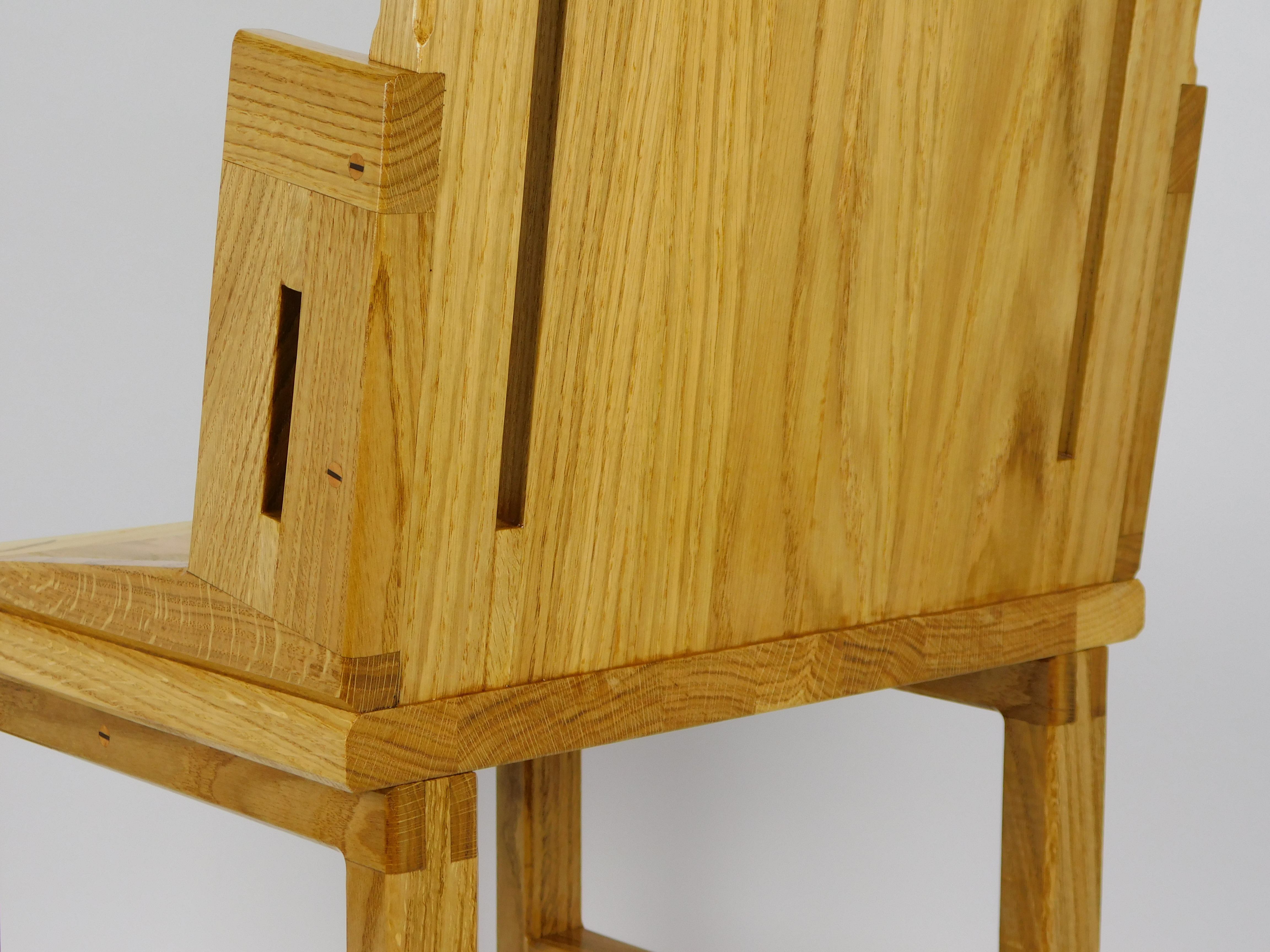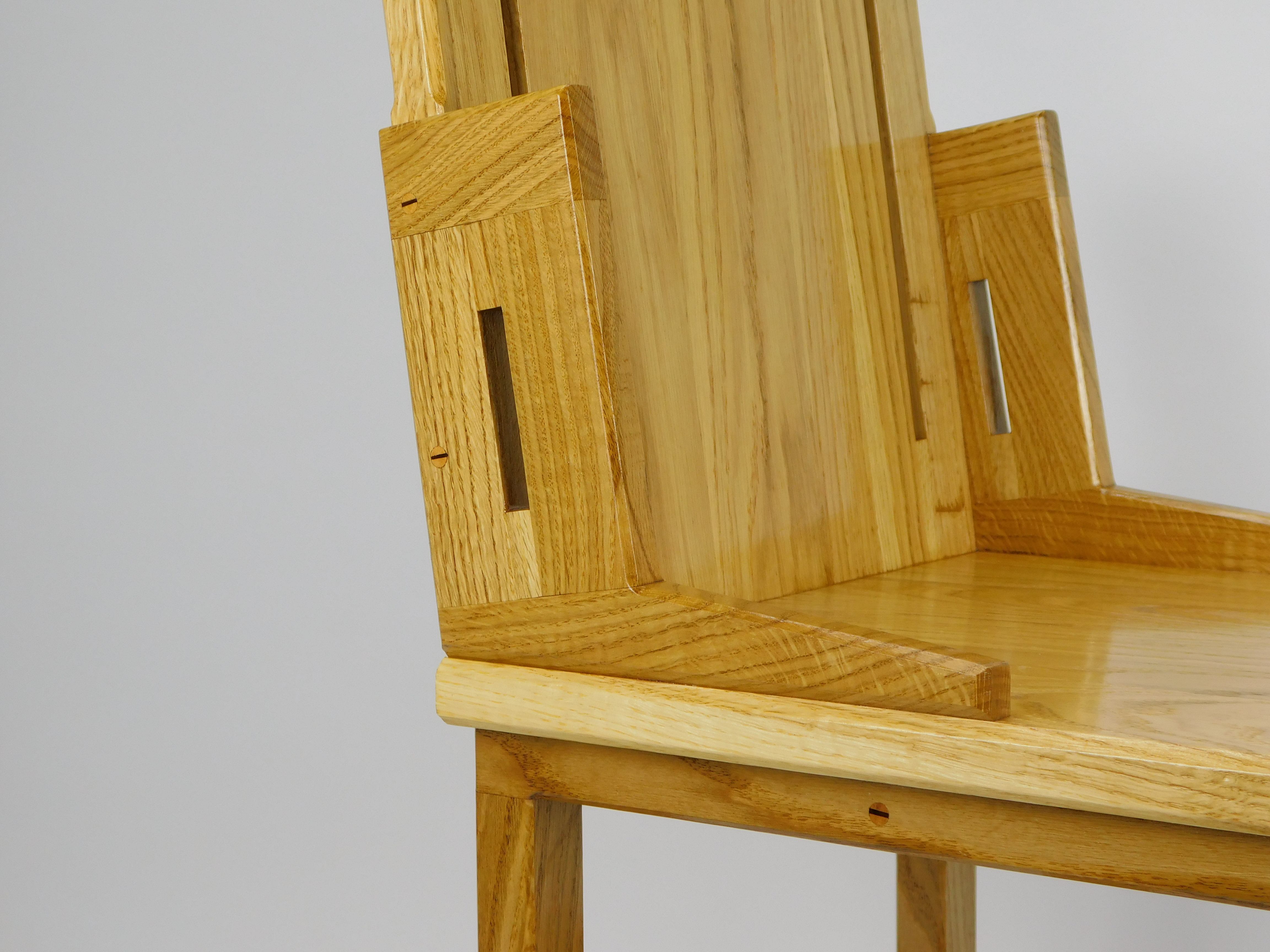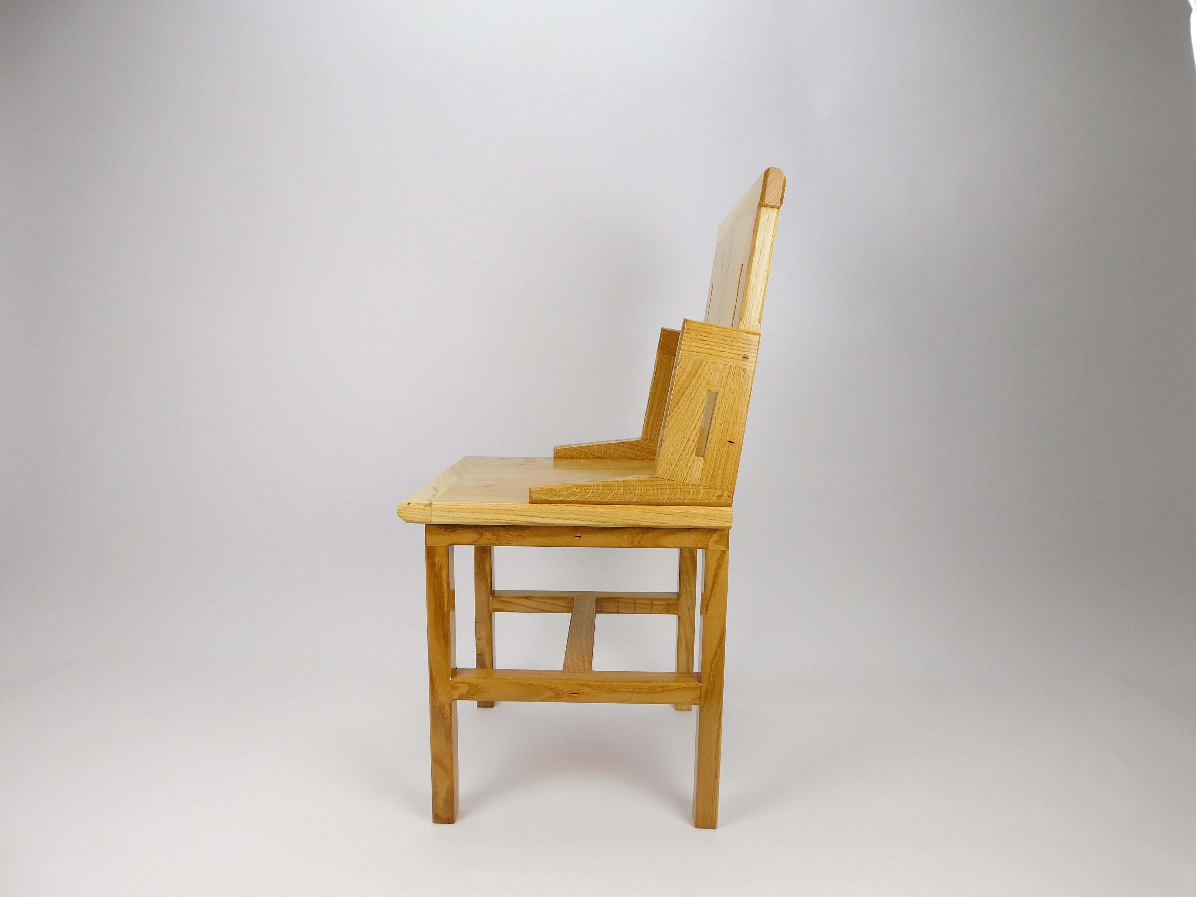 FurnitureThe chair presents itself entirely as a solid light oak wood construction, exuding natural warmth and simplicity. Its design is functional yet has subtle, artistic details.